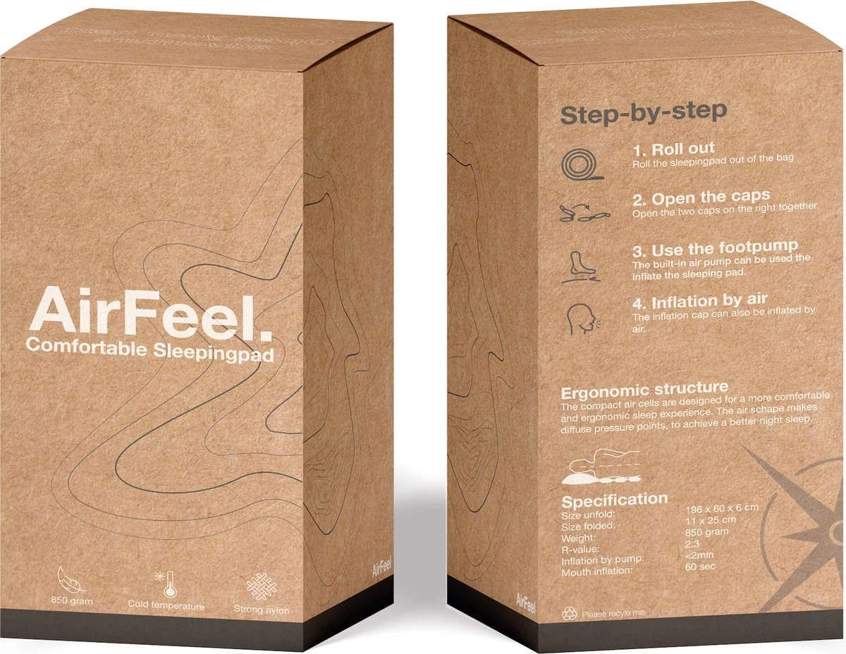 Opzoek naar een comfortabele nachtrust tijdens jouw avontuur? De AirFeel slaapmat is een speciaal ontwikkeld lichtgewicht slaapmatje met een unieke structuur voor de beste nachtrust. Vind je opblazen met de mond ook zo vervelend? De AirFeel slaapmat heeft naast het ventiel ook een ingebouwde voetpomp, waarmee je het slaapmatje in minder dan 2 minuten volledig hebt opgepompt.