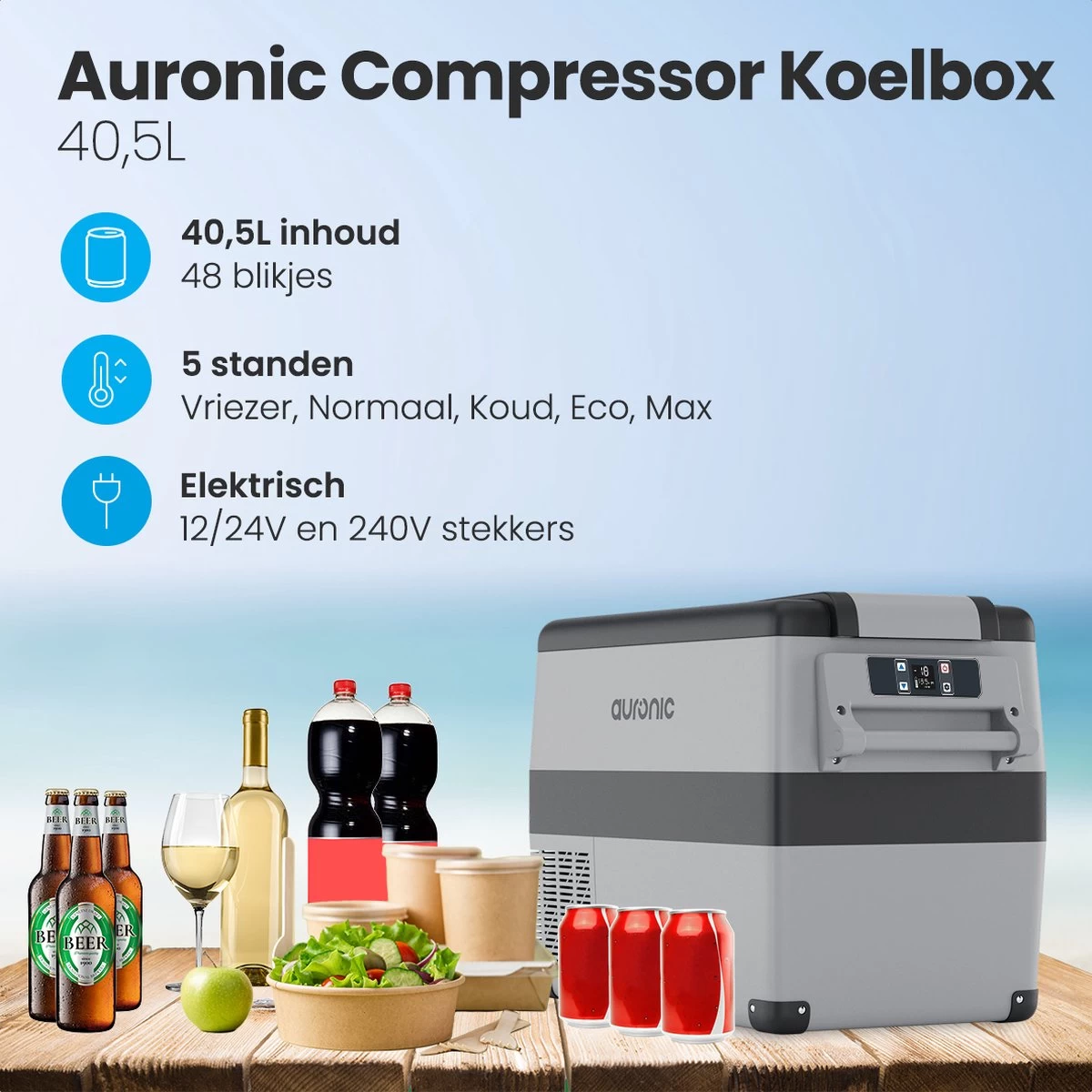 Geniet van een heerlijk dagje weg met deze krachtige Elektrische Compressor Koelbox van Auronic! Dankzij de capaciteit van 40,5 liter kun je maar liefst 48 blikjes koel houden, je hoeft je daarom geen zorgen te maken dat jouw drankjes of snacks gedurende de dag warm worden. Het robuuste en schokbestendige ontwerp zorgt ervoor dat jouw inhoud onderweg altijd veilig is. Het beste van alles is dat de koelbox wordt geleverd met elektrische stekkers die werken op 12/24 V en 240 V, zodat je er zeker van bent dat je de koelbox altijd van stroom kunt voorzien. Kies uit de vijf standen: Vriezer, Normaal, Koud, Eco en Max!