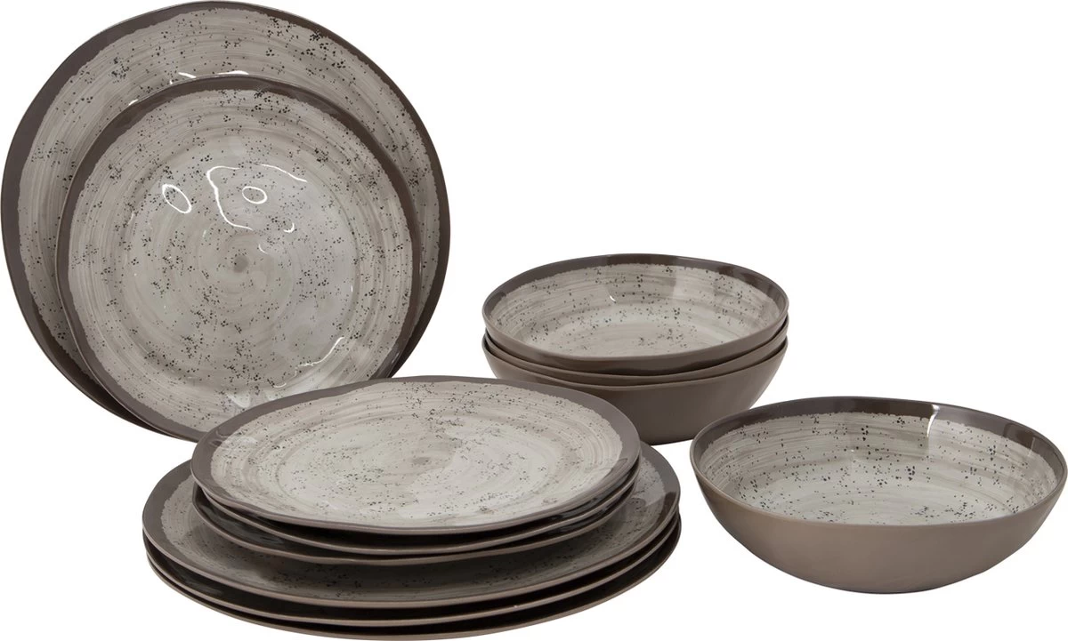 Ons Halo assortiment is voorzien van een stijlvol design. Het beige servies heeft een mooie natuurlijke uitstraling. Naast het prachtige design is het servies zeer licht en stevig. Het servies is ideaal voor op de camping, aangezien deze vrijwel onbreekbaar, breukbestendig en kraswerend is. Het servies kan ook prima thuis gebruikt worden. De 12-delige set is gemaakt van hoogwaardig 100% melamine en is vaatwasmachinebestendig en food approved. Deze stijlvolle set is geschikt voor 4 personen en bestaat uit 4 ontbijtborden, 4 dinerborden en 4 kommen. Afmetingen: Ø Bord: 27.6 cm. Ø Bord: 23 cm. Ø Kom: 19.5 cm.