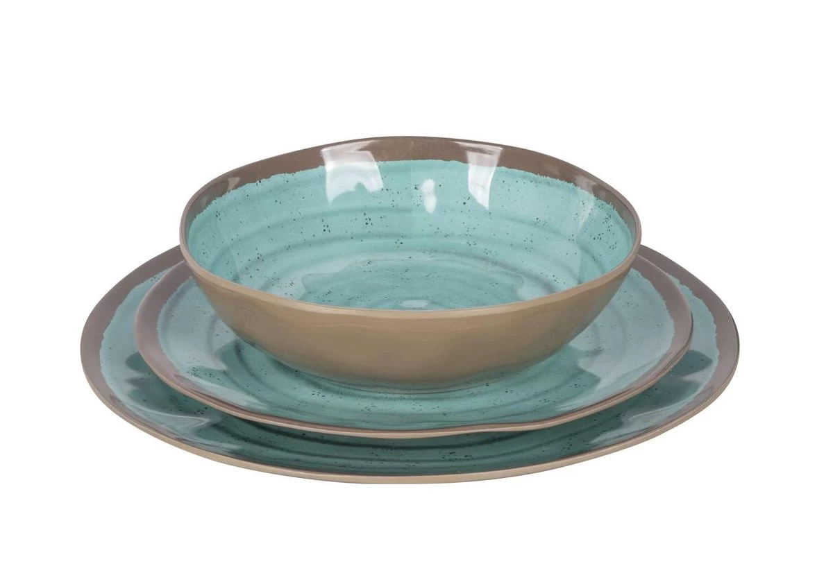 Een luxe 12-delig servies van 100% melamine. Het servies heeft een aardewerk design en voorziet je tafel van een trendy en moderne look. De melamine serviesset is vrijwel onbreekbaar en zeer licht van gewicht. Daarnaast is het servies kraswerend en vaatwasmachinebestendig. Deze stijlvolle set is geschikt voor 4 personen en bestaat uit 4 ontbijtborden, 4 dinerborden en 4 kommen. Afmetingen: Ø Bord: 27.6 cm. Ø Bord: 23 cm. Ø Kom: 19.5 cm.
