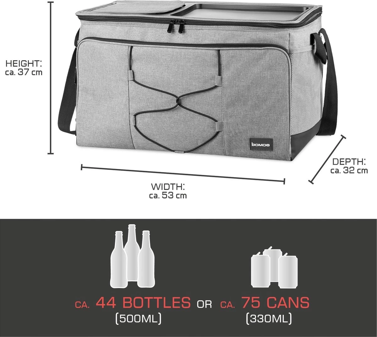 De koelbox heeft een volume van ca. 52 liter en afmetingen van ca. 53x37x32 cm. In de koeltas zittten een afneembare, waterdichte folie en een stabiliserende bodemplaat, zelfs ijskoud water kan op deze manier worden opgeborgen. Een verstelbare, gewatteerde schouderband en twee zijhandvatten maken het transport comfortabel en gemakkelijk. De bijzonderheid? De tas kan zowel gebruikt worden om warm te houden als om het koud te houden.