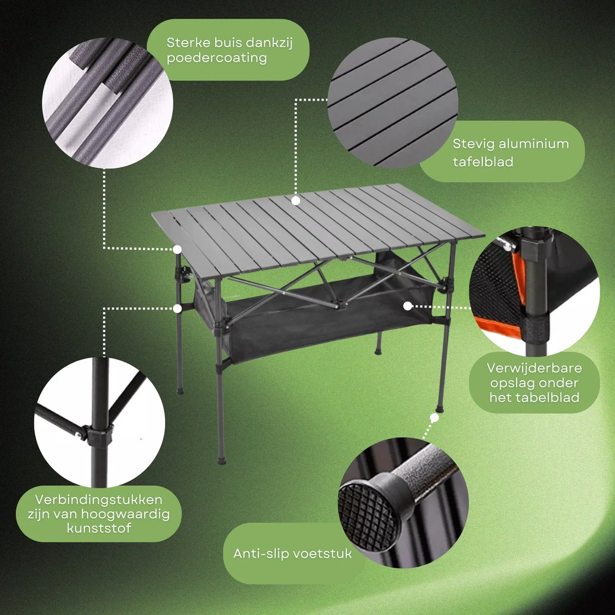 – Door het waterbestendige design kan de campingtafel ook tegen de regenbuien