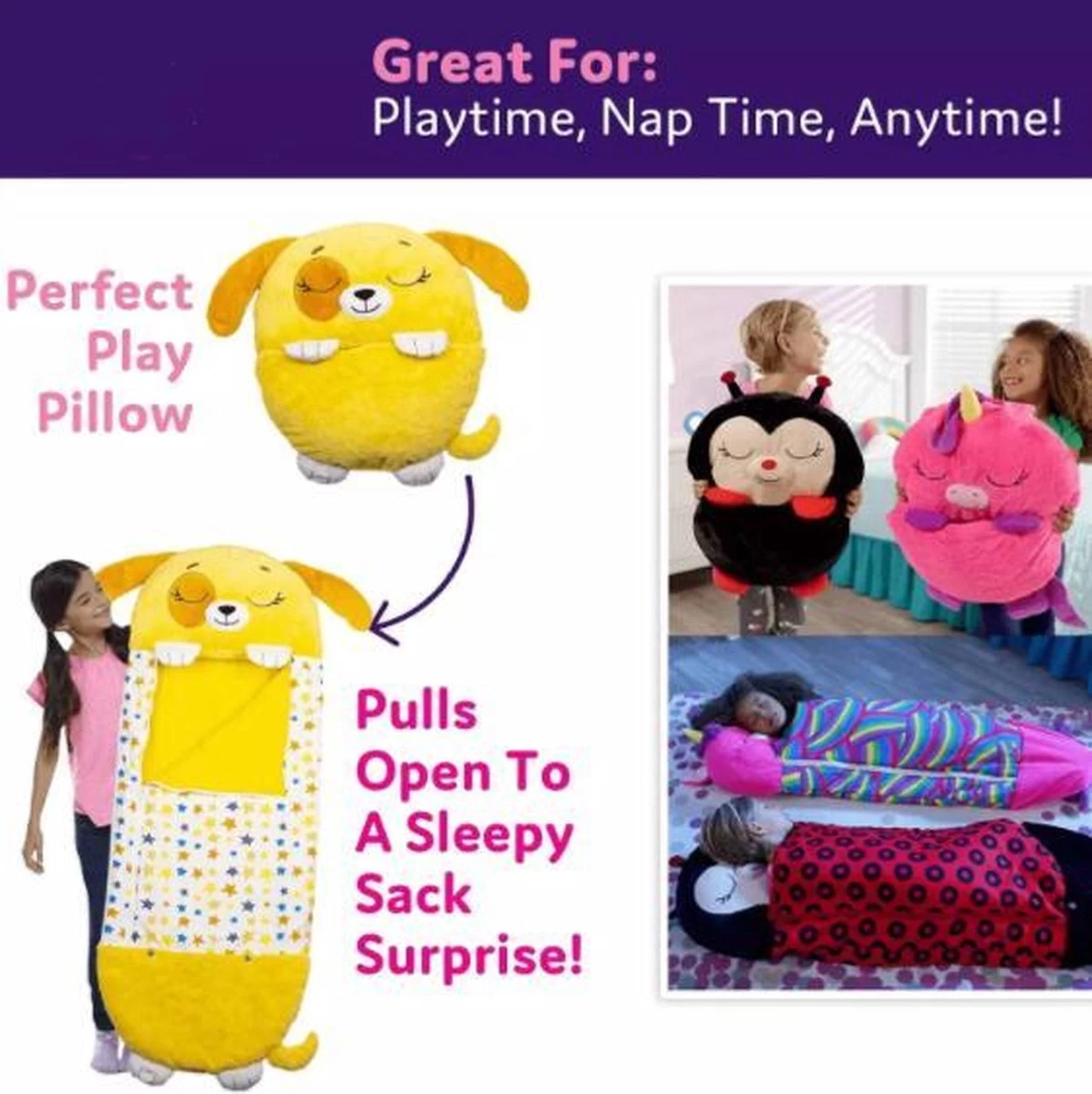 Vrolijke slaapzak voor kinderen: speelkussen slaapzak in een paar seconden verander je van een speels speelkussen in een draagbare speelslaapzak met geïntegreerd kussen. Ideaal om te overnachten met familie of hereniging met familie