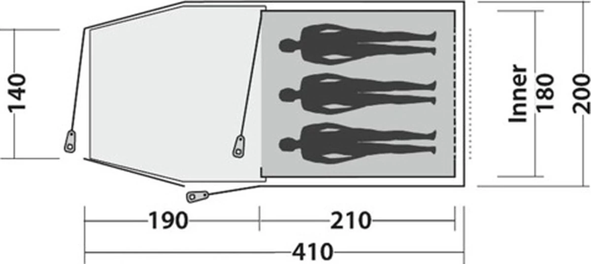 De tent heeft een slim, snel op te zetten tunnelontwerp met 3 stokken en de buitentent heeft vrolijke kleuren. De tent biedt voldoende flexibele ruimte voor drie personen. De tent heeft een royale leefruimte met twee ramen met gordijnen, een voor- en zijdeur, een afneembaar grondzeil en drie ventilatieopeningen voor voldoende ventilatie. Voor het gemak is er een ophangpunt voor een lantaarn en een opbergvak.