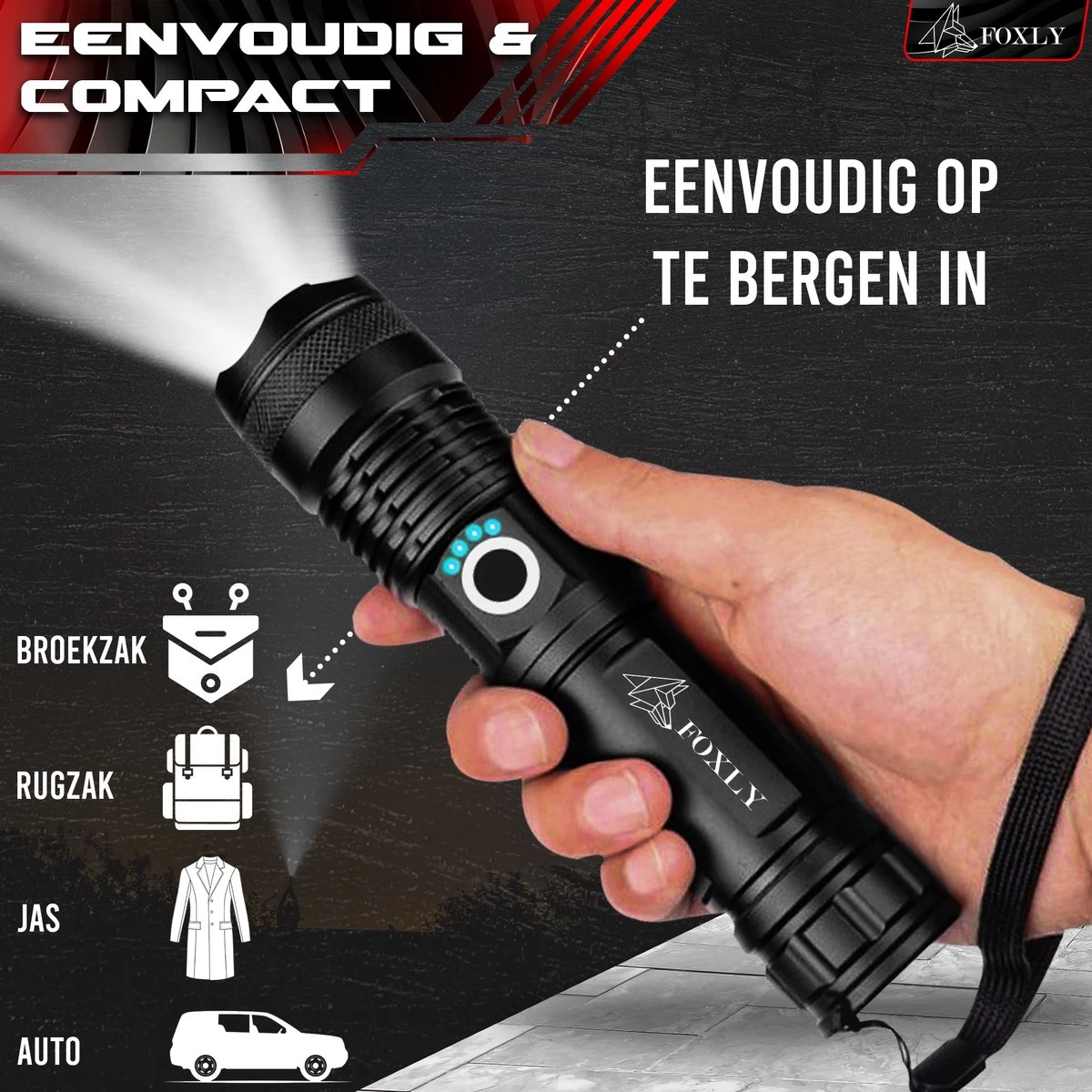 De Foxly zaklamp is uiterst geschikt voor op reis, tijdens het kamperen, bij het monteren van onderdelen, tijdens het nachtvissen, tijdens het klussen en bij stroomuitval. Doordat de zaklamp is ontworpen in een compact design is deze makkelijk op te slaan in huis, in de auto of in een broekzak. De lamp is voorzien van LED-lampen waardoor deze een extra lange levensduur hebben en de accu lang meegaat. Ben jij opzoek naar een multifunctionele zaklamp? Dan is de Foxly zaklamp pro het product voor jou!