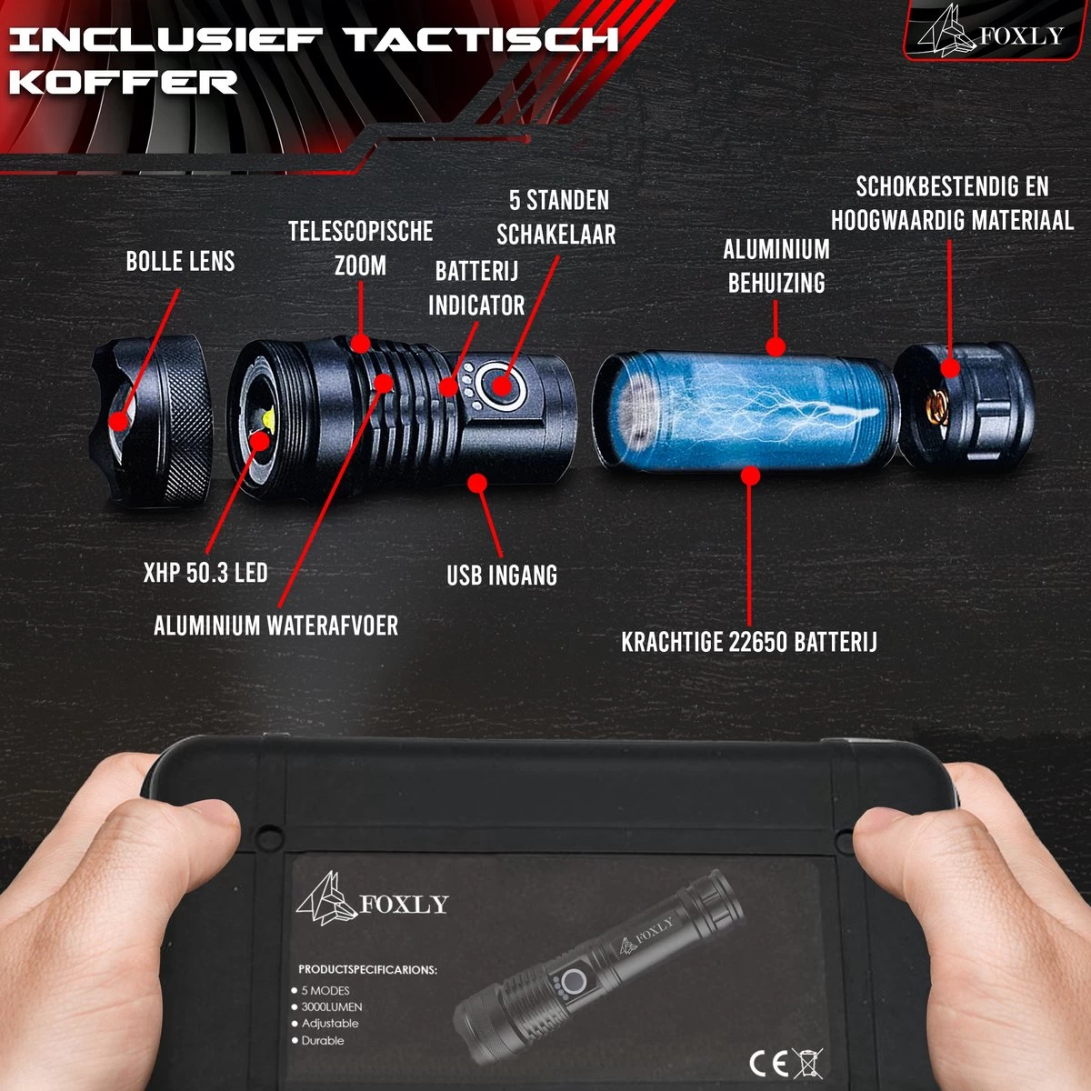 Inhoud verpakking: 1x FOXLY® Militaire LED Zaklamp inclusief stevige hardcase + 1x 5000mAh batterij + 1x Plastic batterij huls + 1x AAA batterijhouder + 1x USB-B Kabel 1x Gebruiksaanwijzing.
