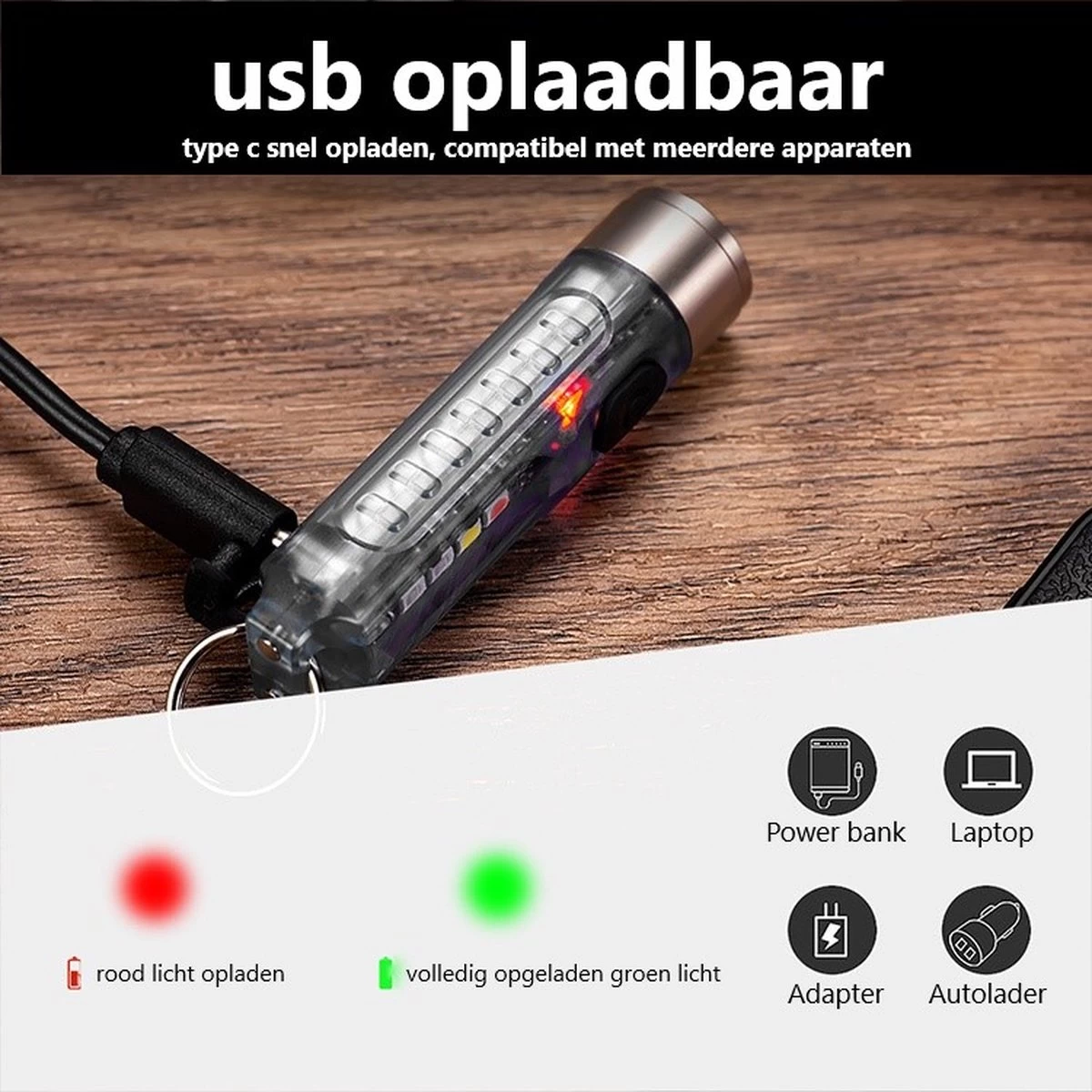 De ingebouwde 300mAh lithium polymeer batterij kan volledig worden opgeladen in slechts 35 minuten via een meegeleverde USB-C kabel. De zaklamp is eenvoudig aan te sluiten op een laptop of netsnoeradapter