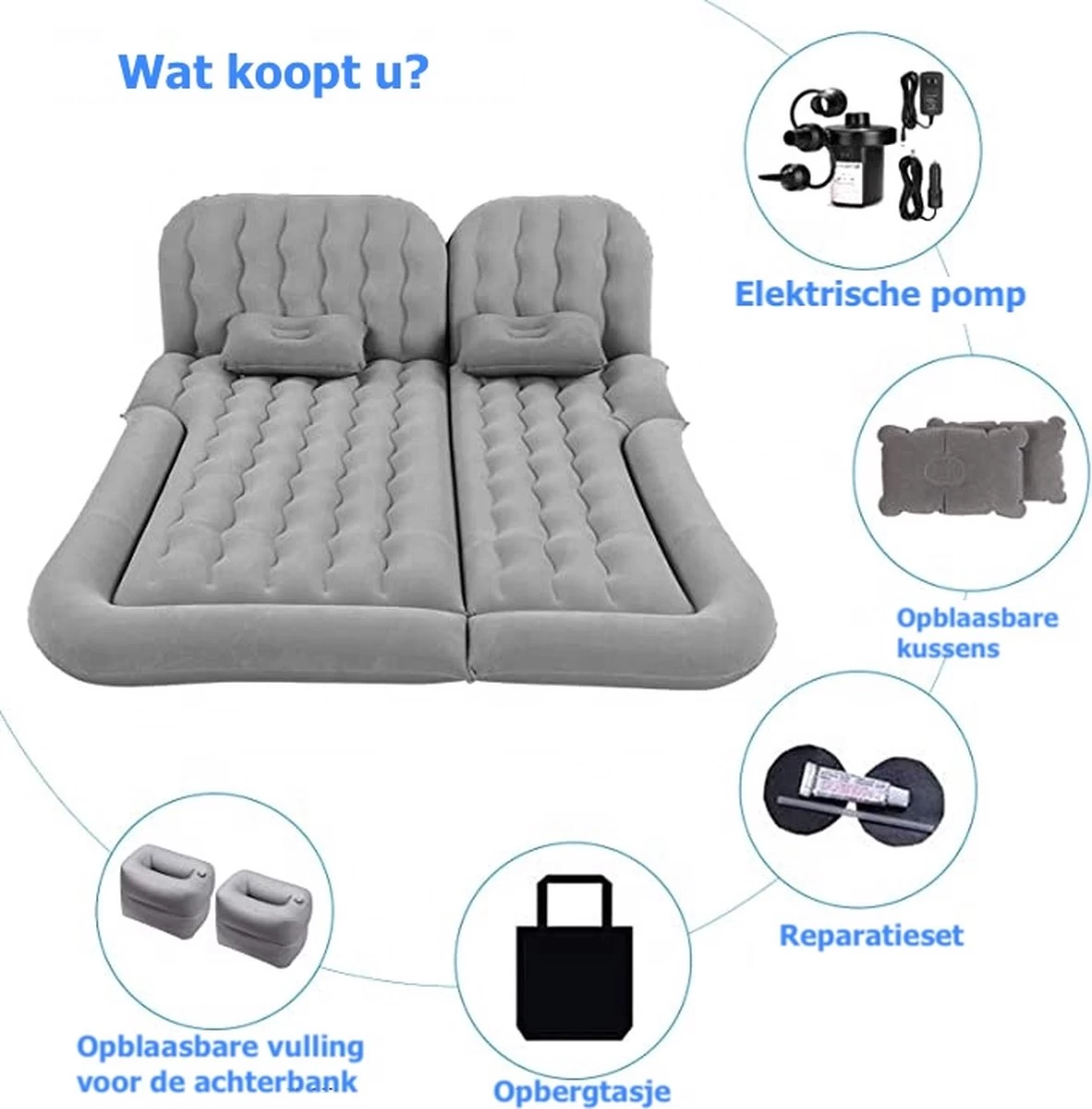 Dit luchtbed kan op verschillende manieren worden gebruikt. Het kan worden gebruikt voor twee personen als de achterbank naar beneden kan worden geduwd of wanneer u in een tent slaapt. Het luchtbed kan ook worden gebruikt voor één persoon als u op de achterbank wil liggen. Het is een erg flexibel luchtbed, want er zijn zes verschillende delen die los van elkaar kunnen worden opgepompt. U kunt het luchtbed moeiteloos oppompen met de elketriche pomp die kan worden aangesloten in elke auto. Als het luchtbed volledig is opgepompt en er net te weinig ruimte is, kan de verdikte rand aan de zijkant en het voeteneind leeg worden gelaten.