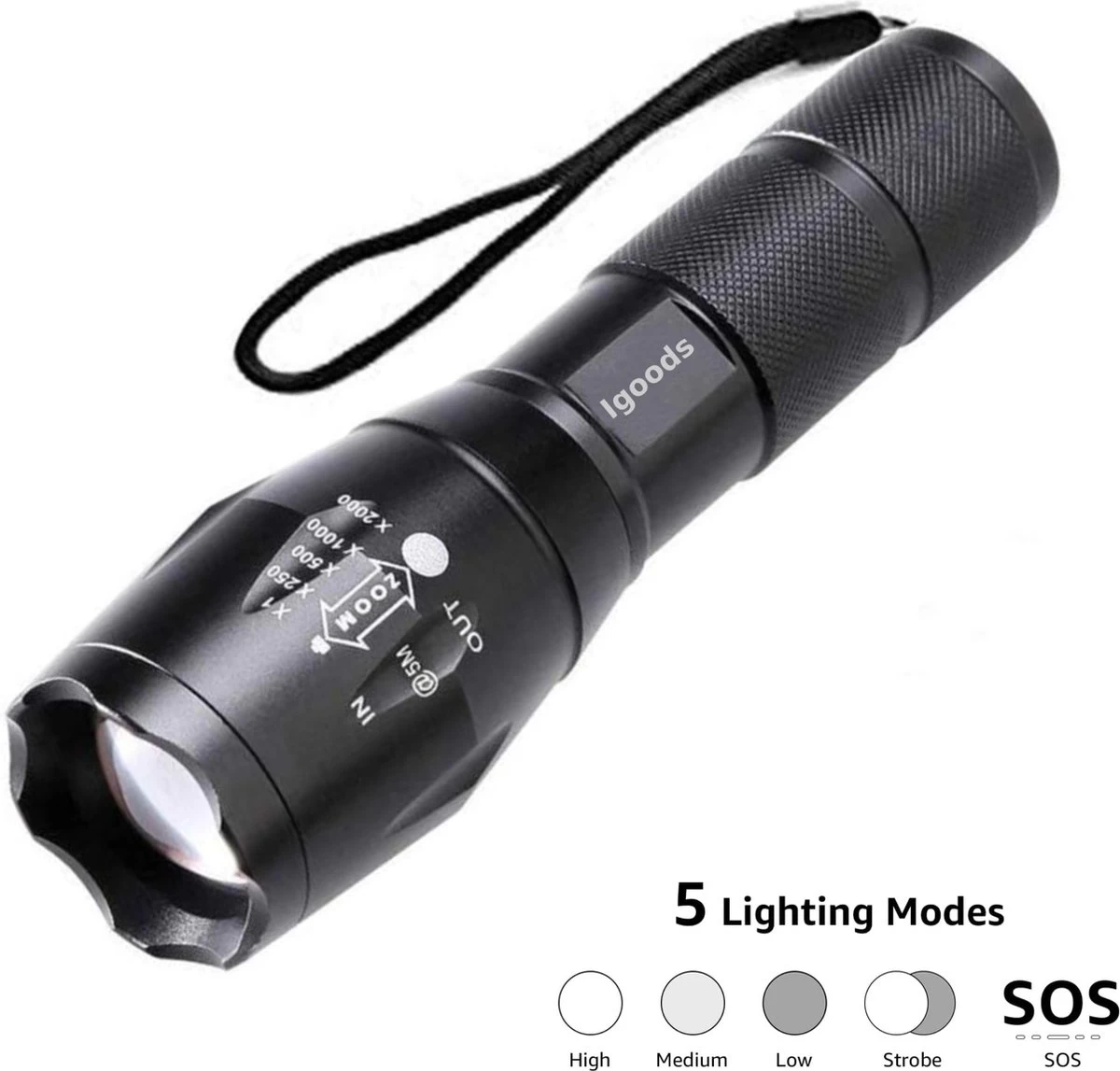 Deze unieke zaklamp van het merk igoods is ideaal om in auto, jaszak of tas te hebben. Deze zaklamp heeft 5 standen High medium low sos strobe.