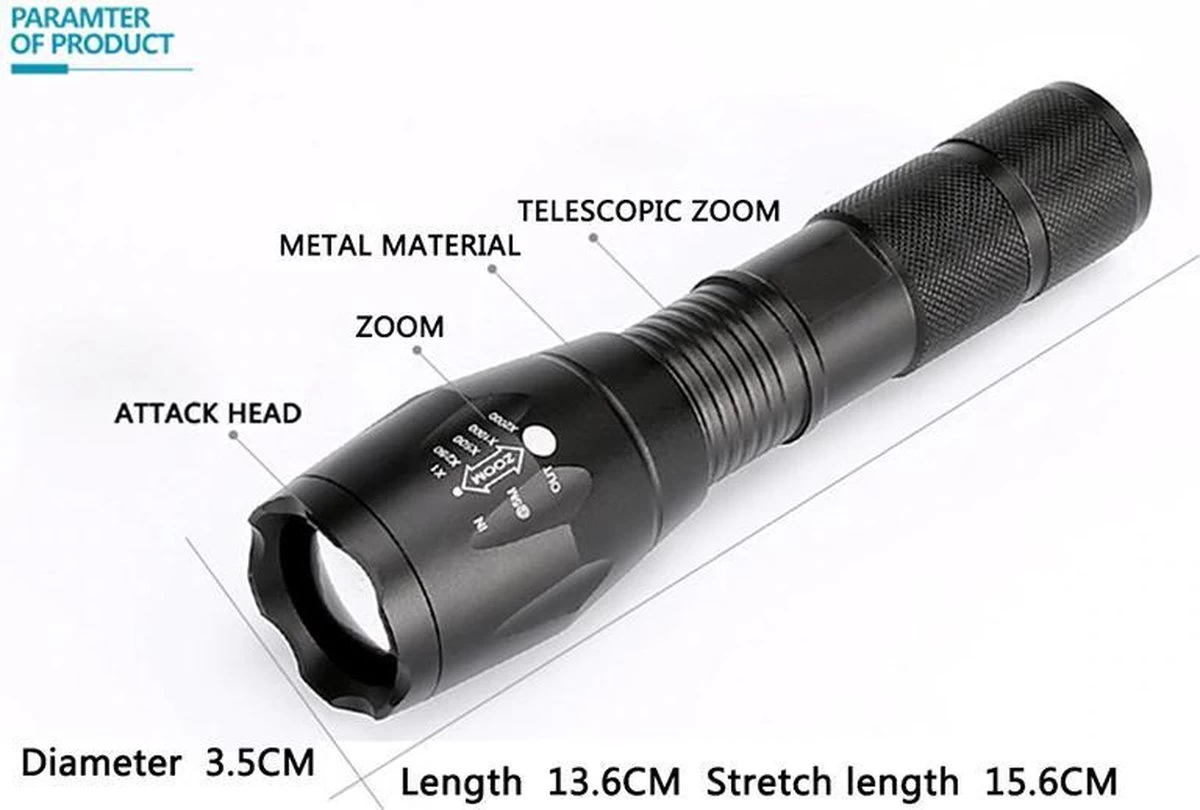 Omdat het van Duurzaam vliegtuig-grade aluminium is gemaakt is het een licht gewicht zaklamp met een hele fijne coting. De batterijen 3x AAA kunnen vervangen worden voor een 1×18650 oplaadbare batterij.