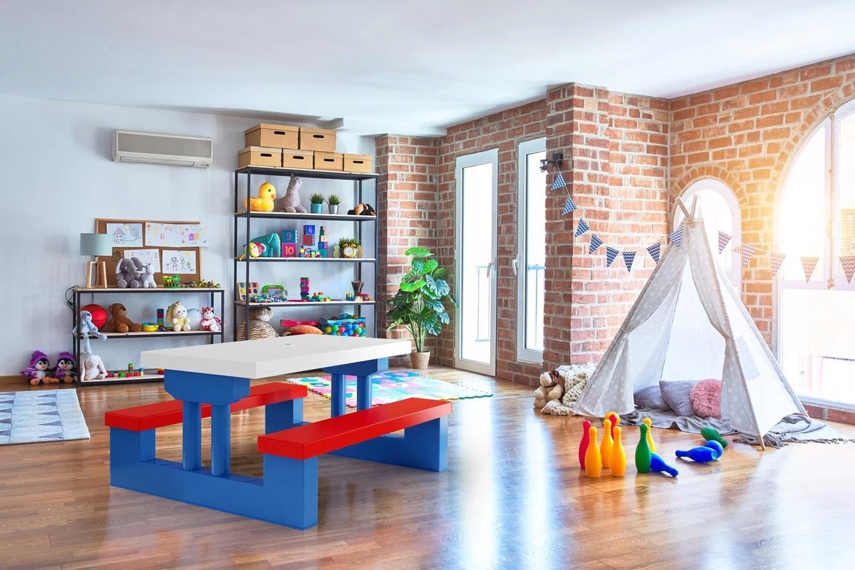 Merkloos Kinder Picknicktafel Met Parasol - Blauw -Kampeerclub 1200x944