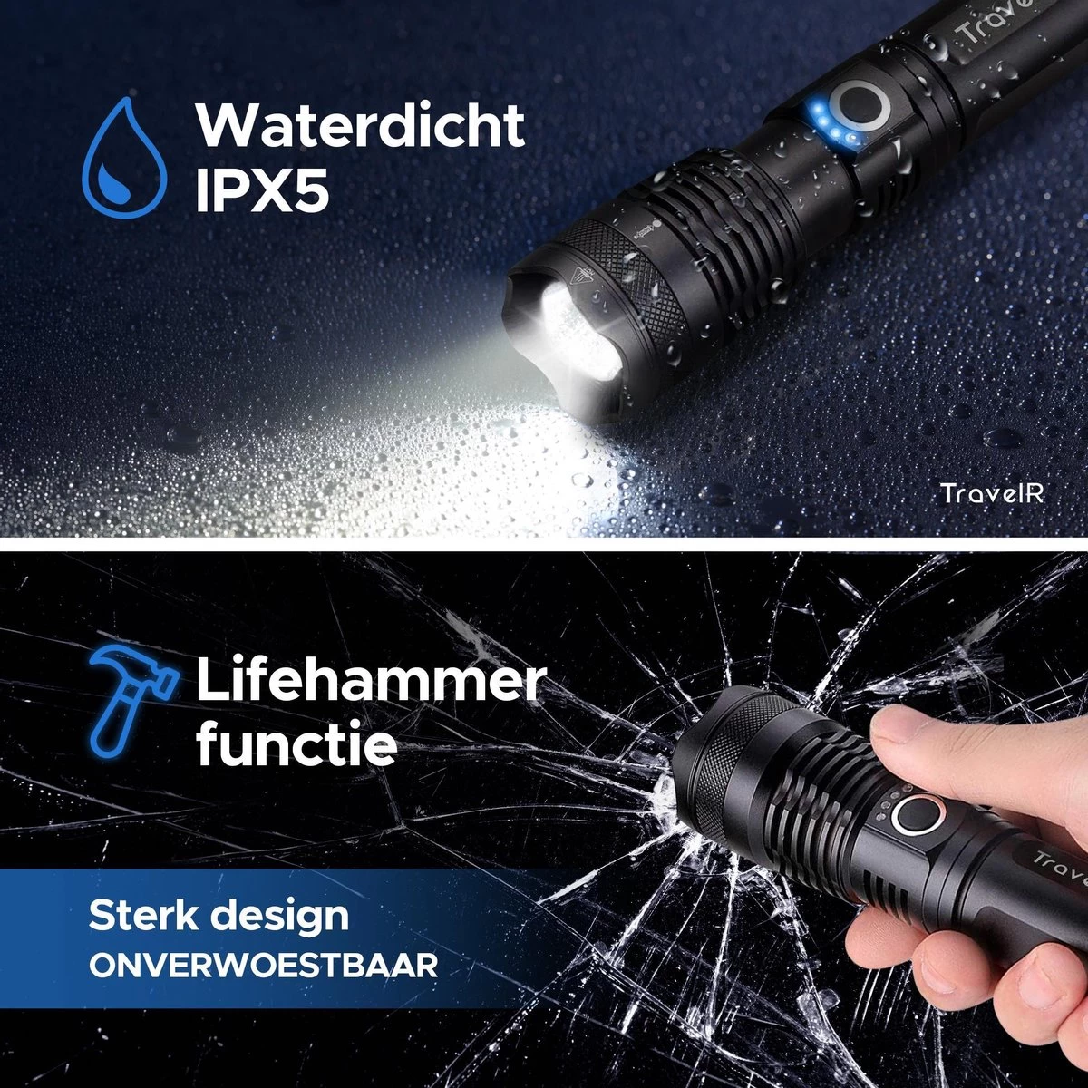 De zaklamp is gemaakt van sterk aluminium. Zo sterk zelfs, dat in noodgevallen een ruit ingeslagen (Lifehammer functionaliteit) zou kunnen worden met de achterzijde van de lamp. Daarnaast is hij ook nog eens waterdicht (IPX-5) en bestendig tegen allerlei extreme omstandigheden.