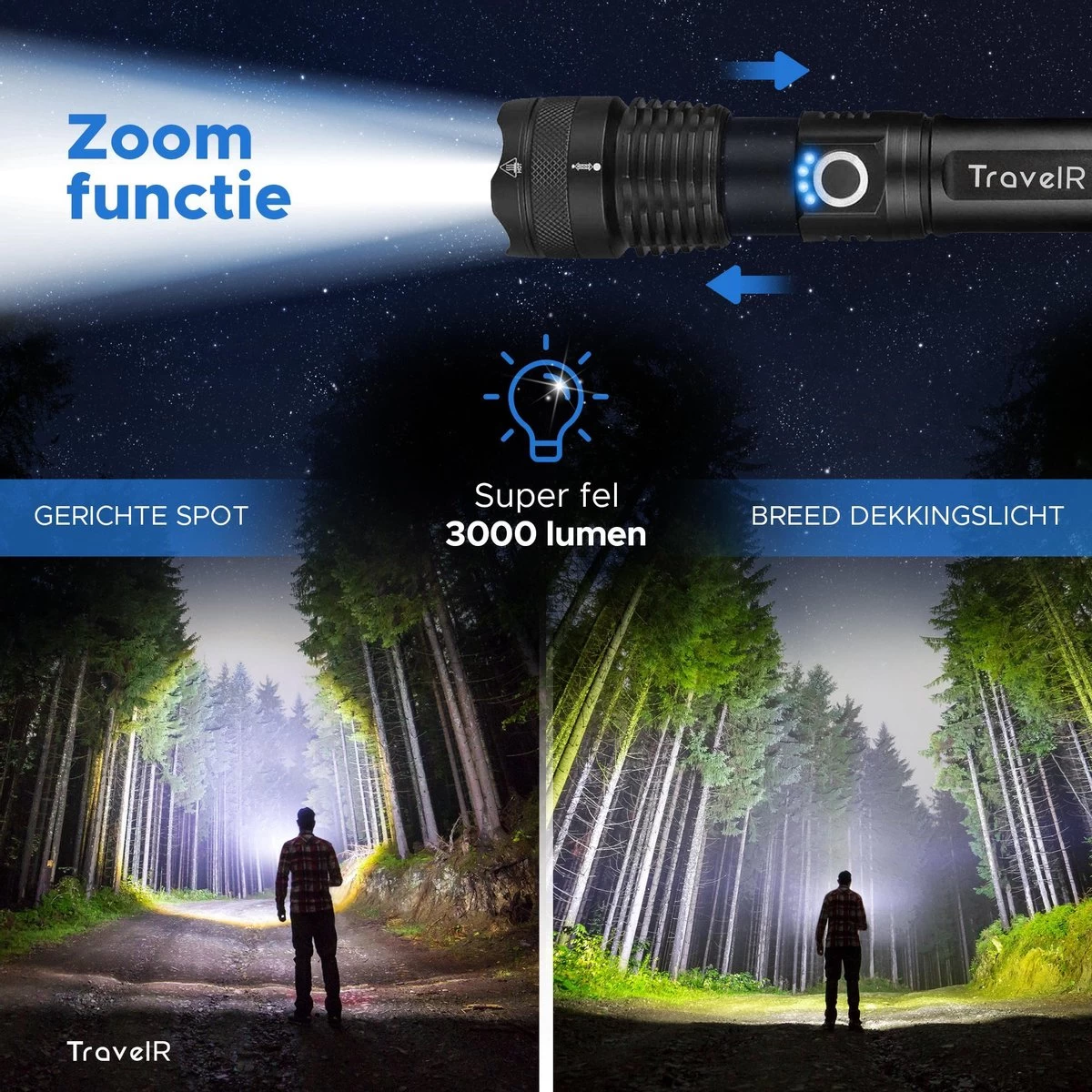 De felheid van de TravelR militaire zaklamp kun je zelf eenvoudig instellen, zo zet je deze op extra fel licht, helder licht of gedimd licht. Ook kun je kiezen tussen de twee verschillende lichtfuncties: stroboscoop (knipperend licht) en SOS. Naast de verschillende lichtstanden is de zaklamp ook voorzien van een zoomfunctie waarmee je de focus van het licht kan in- en uitzoomen, met een maximum bereik van wel 300 meter!