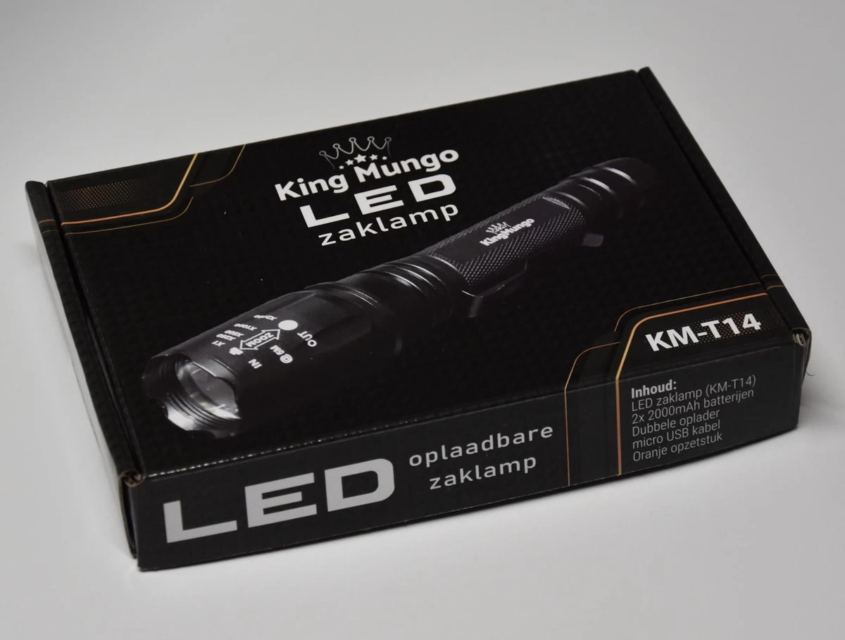 alle outdoor activiteiten zoals kamperen, vissen, wandelen, hond uitlaten, fietsen en scouting. Deze ledzaklamp heeft meerdere lichtfuncties en in geval van nood heeft deze tactical zaklamp van King Mungo (KM-T14) ook een SOS signaal. Met de handige zoomfunctie kun je gemakkelijk zoomen door de kop van de lamp heen en weer te schuiven.