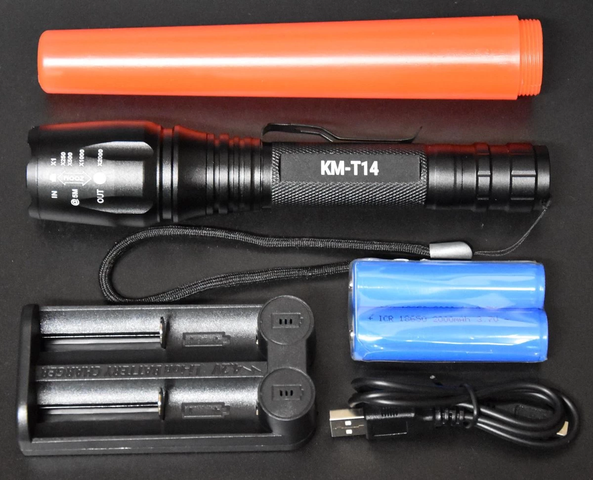 Krachtige militaire Zaklamp LED met 1000 lumen. Professionele King Mungo LED zaklamp inclusief 2x 18650 oplaadbare batterijen van 2000mah (echte van 46 gram, veel slechte in omloop), een USB oplader voor 2 stuks.