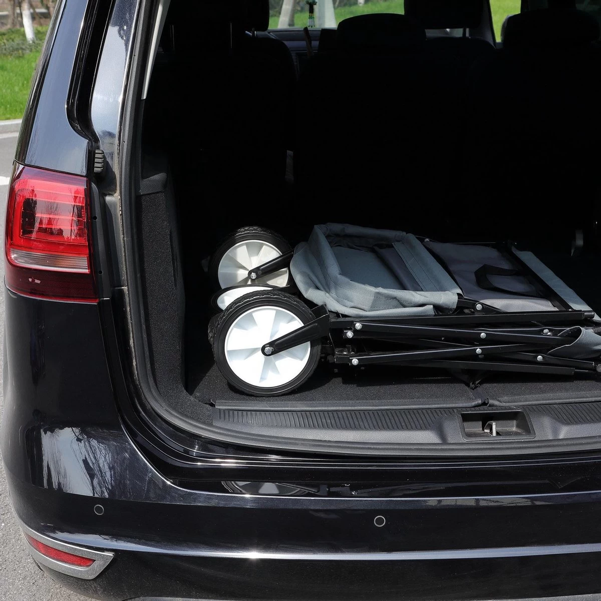 Bovendien zijn de beide voorwielen van de wagen 360° draaibaar. Dit maakt de inklapbare trolley wendbaarder en vergemakkelijkt jouw transport.