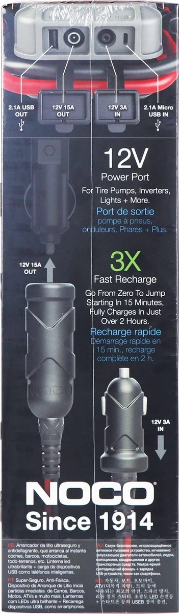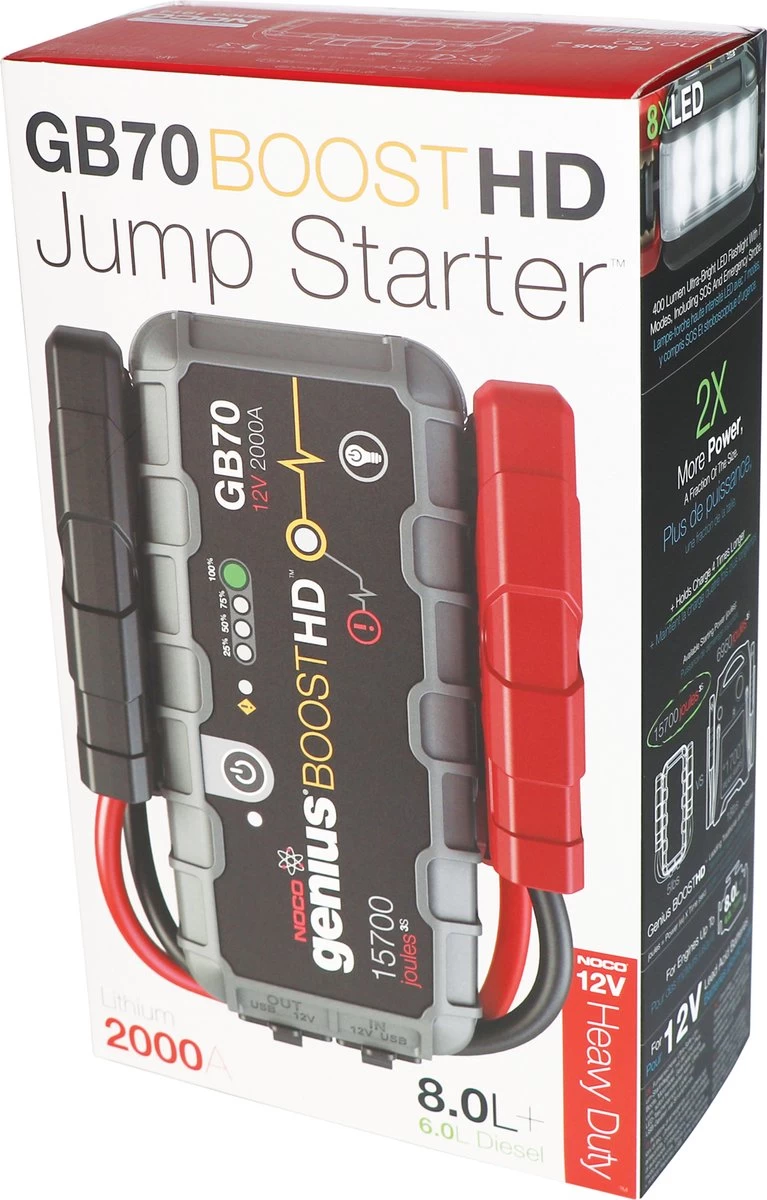 De GB70 is een draagbaar lithium-ion-accu starthulppakket dat 2.000 ampère (15.700 J3S) levert om een lege accu binnen enkele seconden op te starten. Deze starthulp heeft gepatenteerde veiligheidstechnologie die vonkvrije verbindingen en bescherming tegen omgekeerde polariteit biedt, waardoor iedereen hem veilig en gemakkelijk kan gebruiken. Het is een krachtige accu-booster die ook als een draagbare voeding fungeert voor het opladen van USB-apparaten, zoals een smartphone, tablet en nog veel meer. Hij kan ook als voeding dienen voor 12V-apparaten, zoals een bandenpomp, een omvormer en nog veel meer. Ontworpen voor een auto, boot, camper, truck en meer, met een benzinemotor tot 8 liter of een dieselmotor tot 6 liter.* Vonkvrije verbindingen en bescherming tegen omgekeerde polariteit. * Laadt USB-apparaten op, zoals smartphones, tablets en nog veel meer. * Voedt op elke plek 12V-apparaten, zoals bandenpompen, omvormers en nog veel meer. * 400 lumen led-zaklamp met meerdere modi, waaronder SOS. * Start benzinemotoren tot 8 liter en een dieselmotor tot 6 liter. * Levert tot 40 startpogingen op één enkele lading.