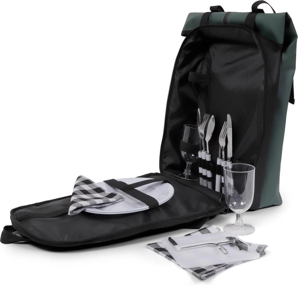Het hoofdcompartiment is te openen door een dubbele ritssluiting. De tas bevat 2 plastic bekers, 2 borden, een bestek set voor 2 personen en een snijplank. Verder zitten er 2 servetten van stof in met een zwart en wit geruit patroon. Ook heeft de tas nog ruimte om bijvoorbeeld een heerlijke fles wijn mee te nemen. Uiteraard mag de toegevoegde kurkentrekker dan ook niet ontbreken. Al het bestek kan bevestigd worden door middel van de elastische banden. Kortom, de perfecte picknick tas voor een dagje uit.