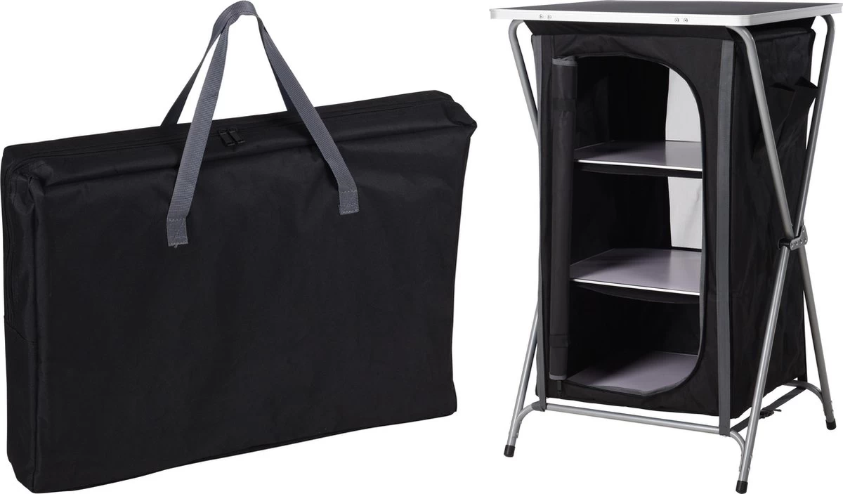Komt u ook altijd opslagruimte tekort op uw vakantiebestemming? Dankzij deze campingkast heeft u ook op de camping altijd alles netjes opgeruimd. De campingkast is gemakkelijk mee te nemen doordat u hem kunt inklappen en in de meegeleverde draagtas kunt opbergen.