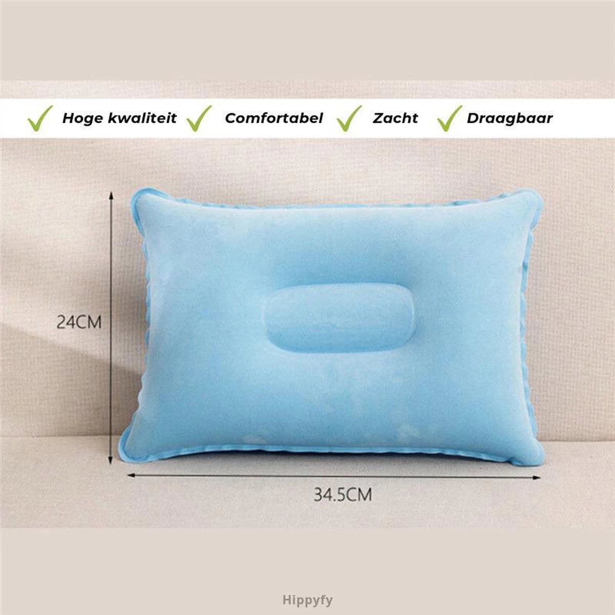 Dankzij de compacte maat kan deze opblaasbare kussen van Hippyfy overal mee naartoe. Echter adviseren wij rekening te houden met de spanning van de kussen en niet op te gaan zitten. Ook raden wij aan, na gebruik de de kussen op te bergen voor langdurig en duurzaam gebruik.