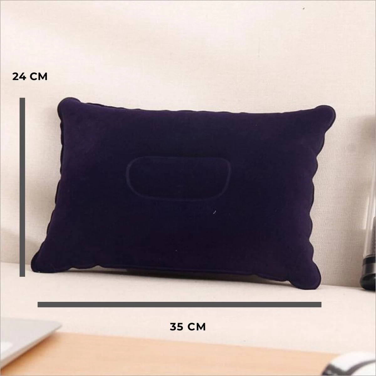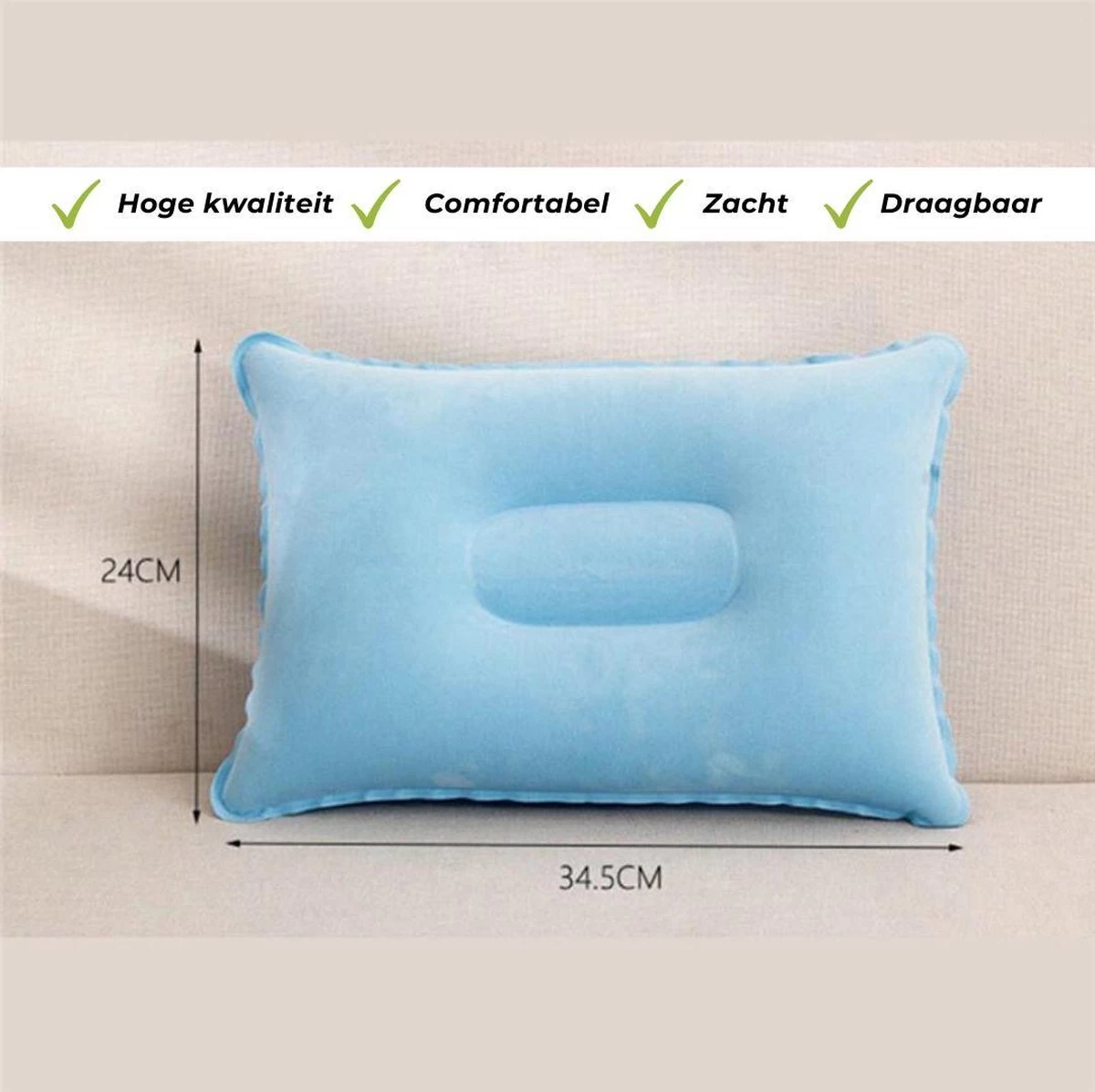 Het opvouwbare formaat is 35 x 24 x 5 cm waardoor je de opblaasbare kussen, makkelijk en overal mee naar toe kunt nemen. Deze opblaasbare kussen is ontworpen met een dubbelzijdige, centrale diepte. Deze diepte is speciaal gevormd voor het achterhoofd. Dankzij het design van de opblaasbare kussen ervaar je meer comfort voor je nek. Tevens ervaar je meer veer in de kussen en past de kussen zich aan bij iedere ligpositie.
