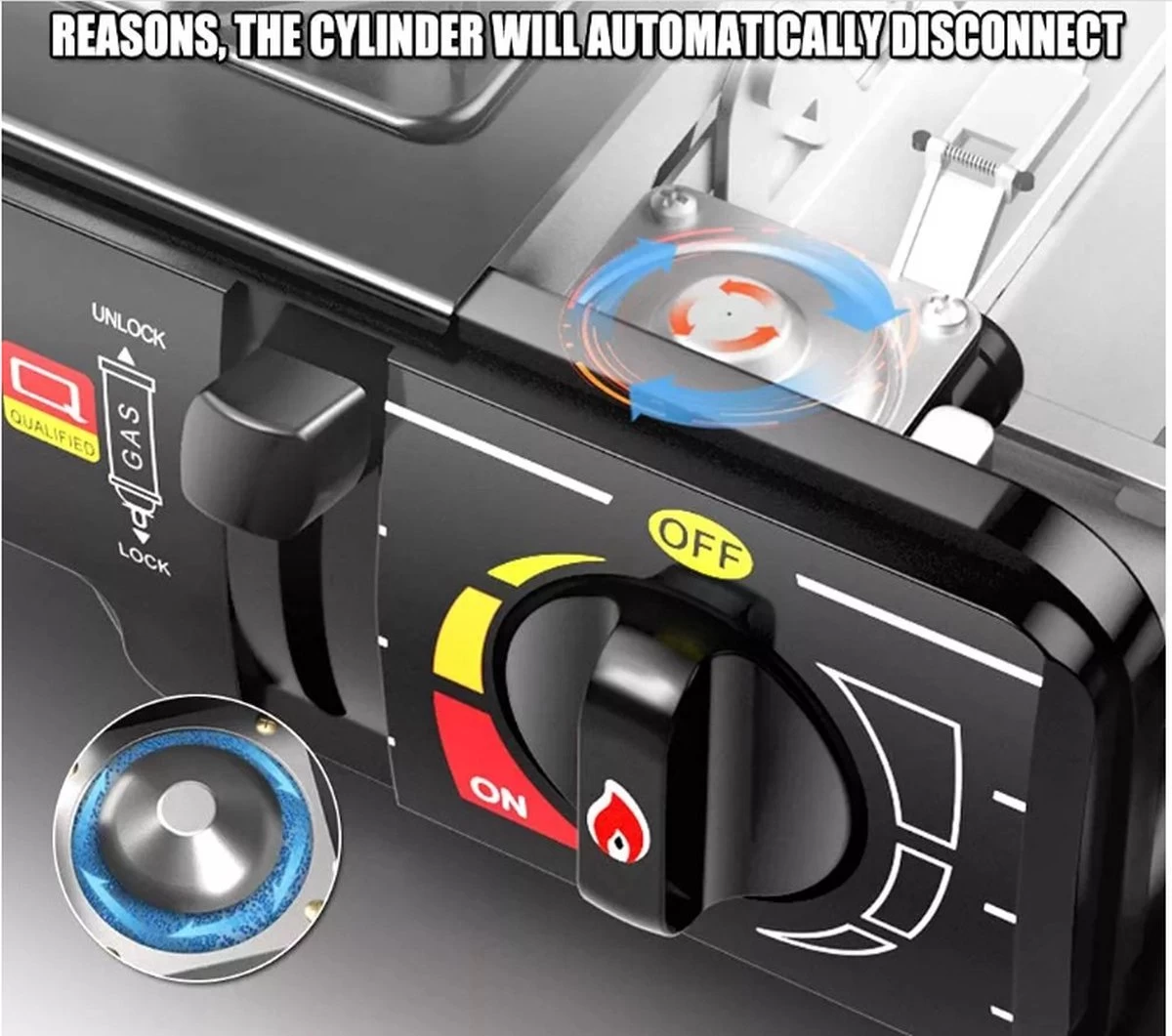 GEMAKKELIJK TE GEBRUIKEN: Het draagbare gasfornuis is gemakkelijk te gebruiken en schoon te gebruiken. Ga als volgt te werk: 1. Plaats het patroon> 2. Open de schuifregelaar> 3. Draai de thermostaat zo ver mogelijk> 4. en de kachel is klaar om te koken of te grillen.
