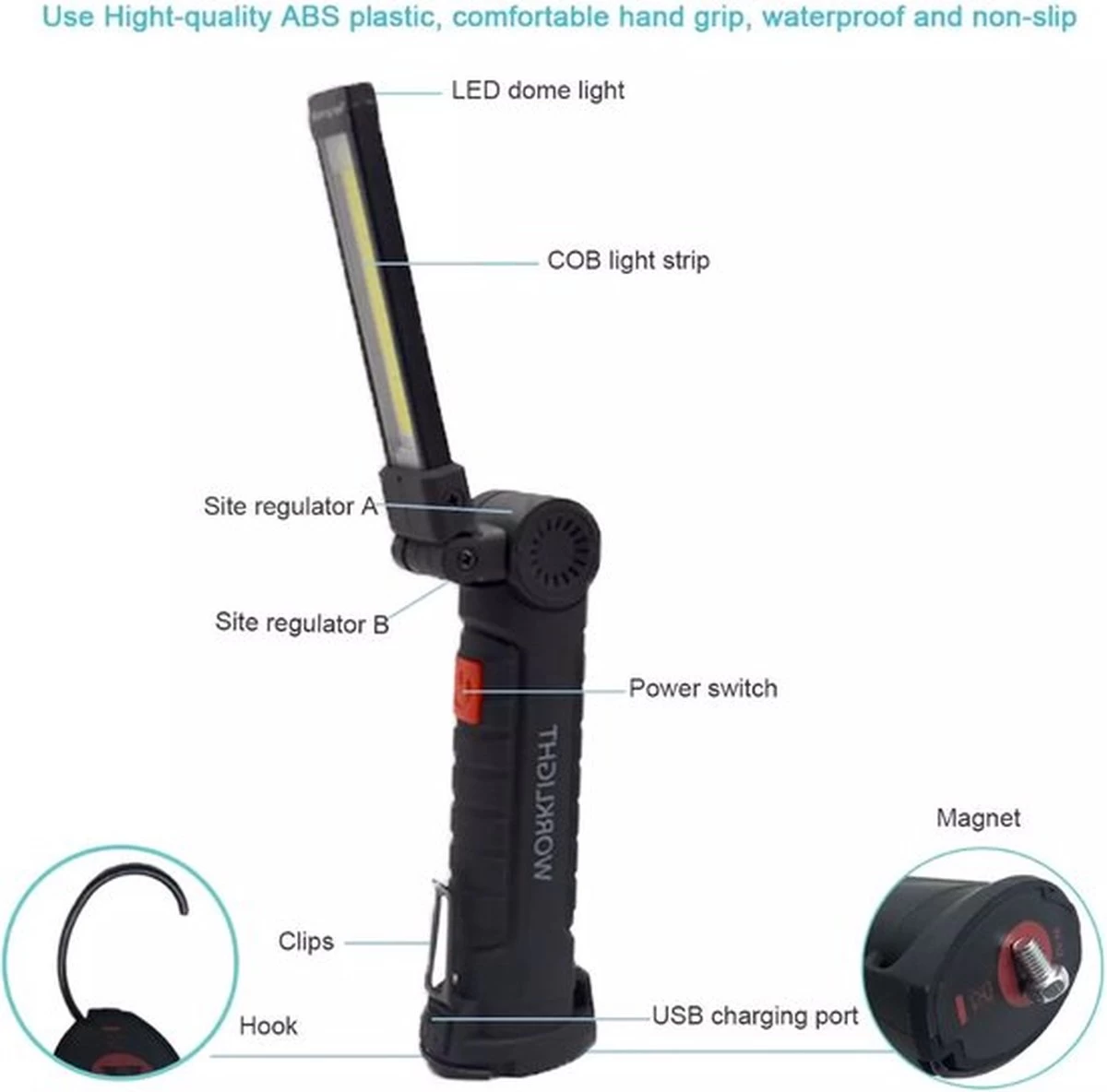 De 360 graden rotatie maakt de lamp veelzijdig inzetbaar. Dankzij de magneetfunctie en haak zijn uw handen vrij wanneer u een specifieke plek wilt verlichten. Ideaal voor autoreparaties, verlichting thuis, kamperen, wandelen, stroomuitval. De lamp wordt geleverd met micro-USB kabel.