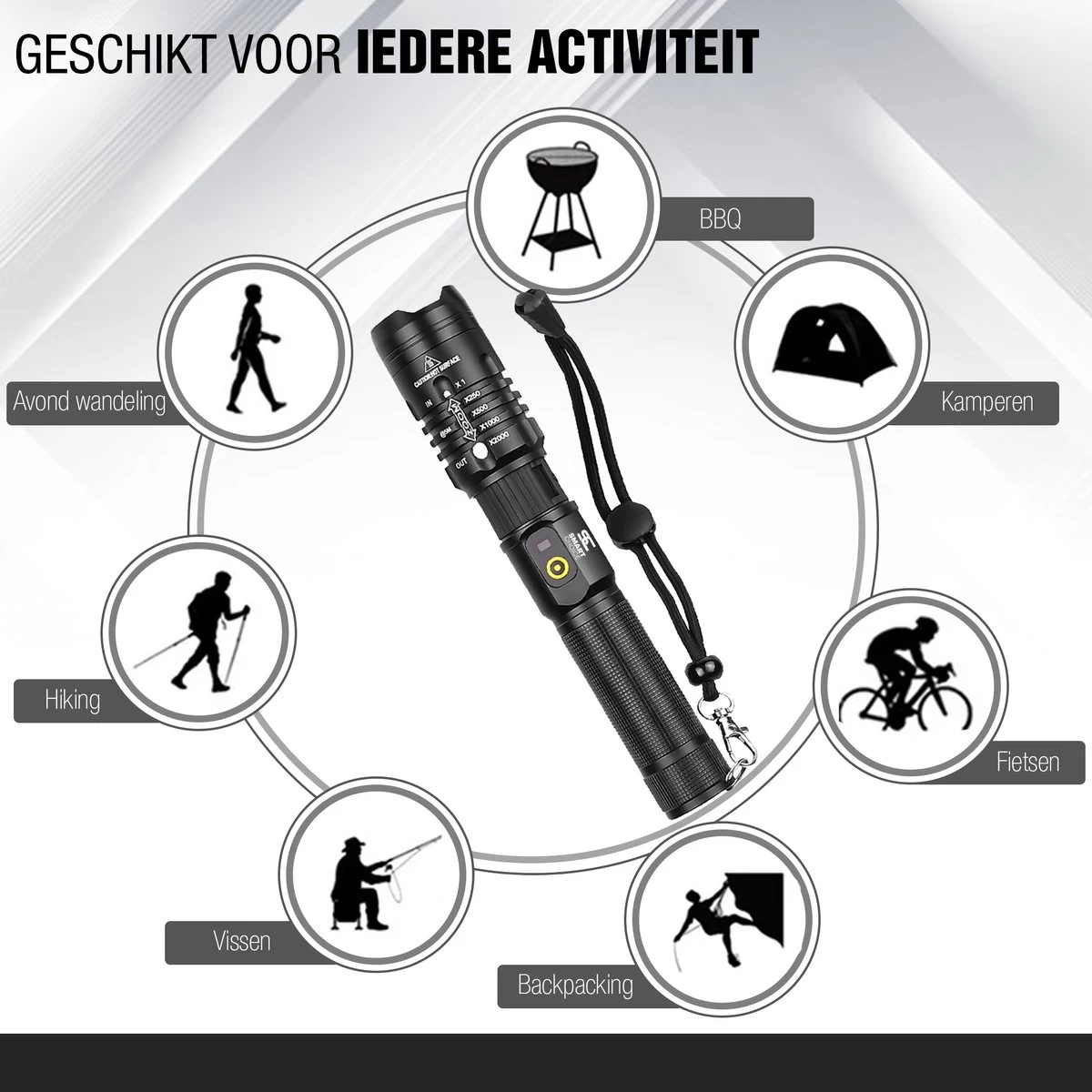 De zaklamp is werkelijk geschikt voor iedere activiteit. Zo kan hij makkelijk overal mee naartoe genomen worden! Gebruik de zaklamp bijvoorbeeld op reis, kamperen, survivallen, nachtvissen, autopech, stroomuitval of tijdens het klussen.