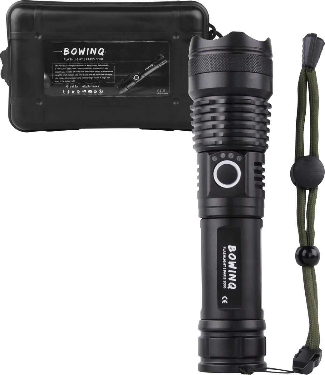 Met deze krachtige en oplaadbare led zaklamp van BOWINQ kun je verder schijnen dan ooit tevoren! Kijk tot een kilometer ver in het diepst van de nacht dankzij heldere led verlichting. De Paris 5000 zaklamp kan iedere situatie en weersomstandigheid aan. Geniet van een maximale gebruiksduur dankzij een zeer krachtige batterij met maarliefst 5000 mAh capaciteit.